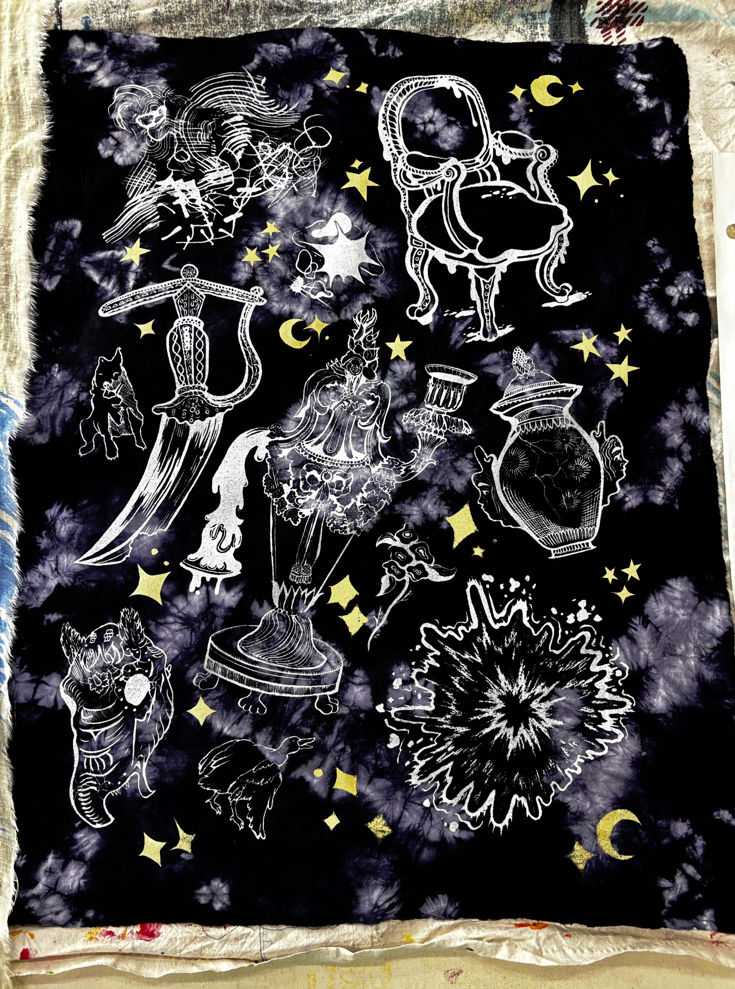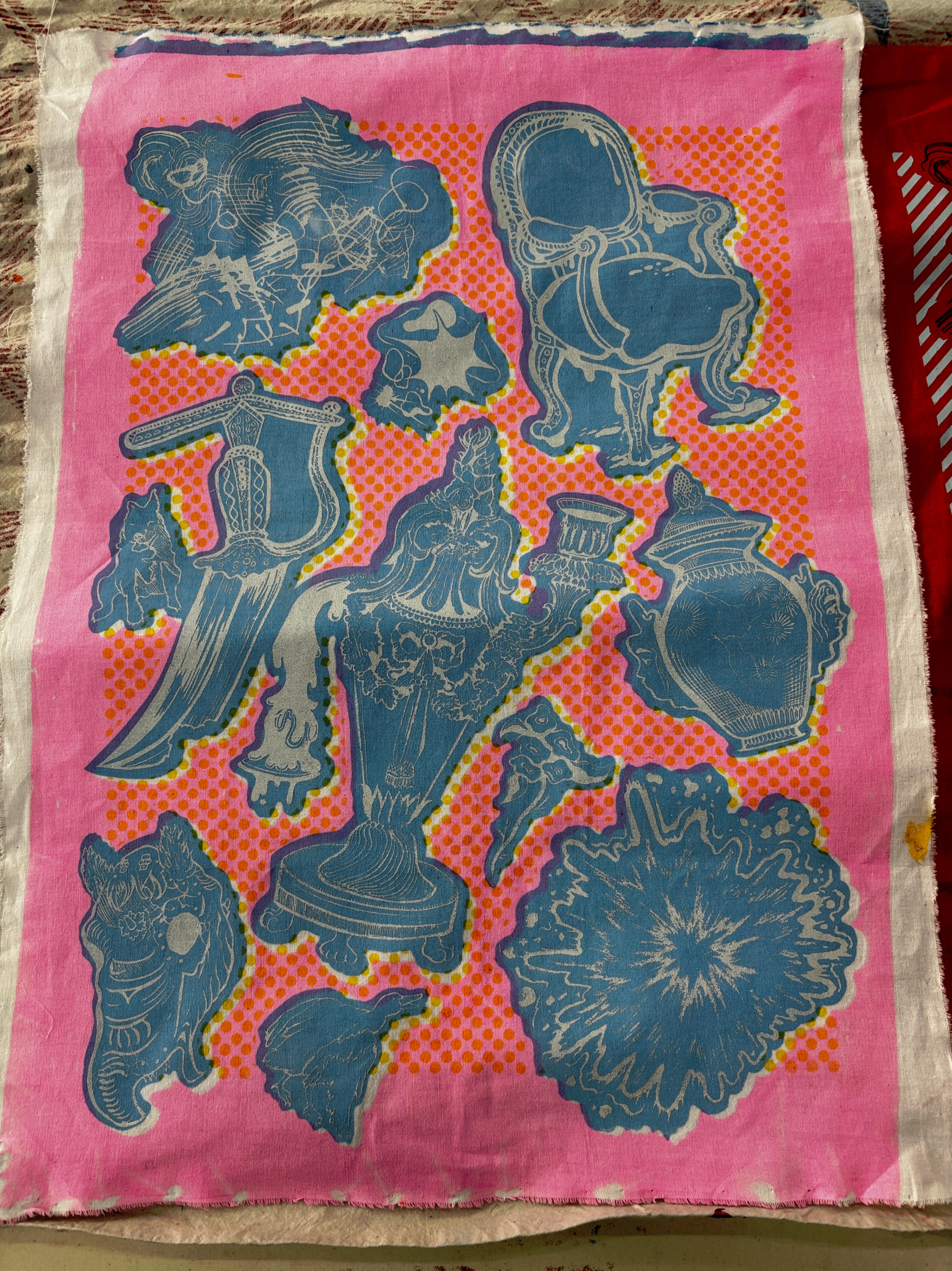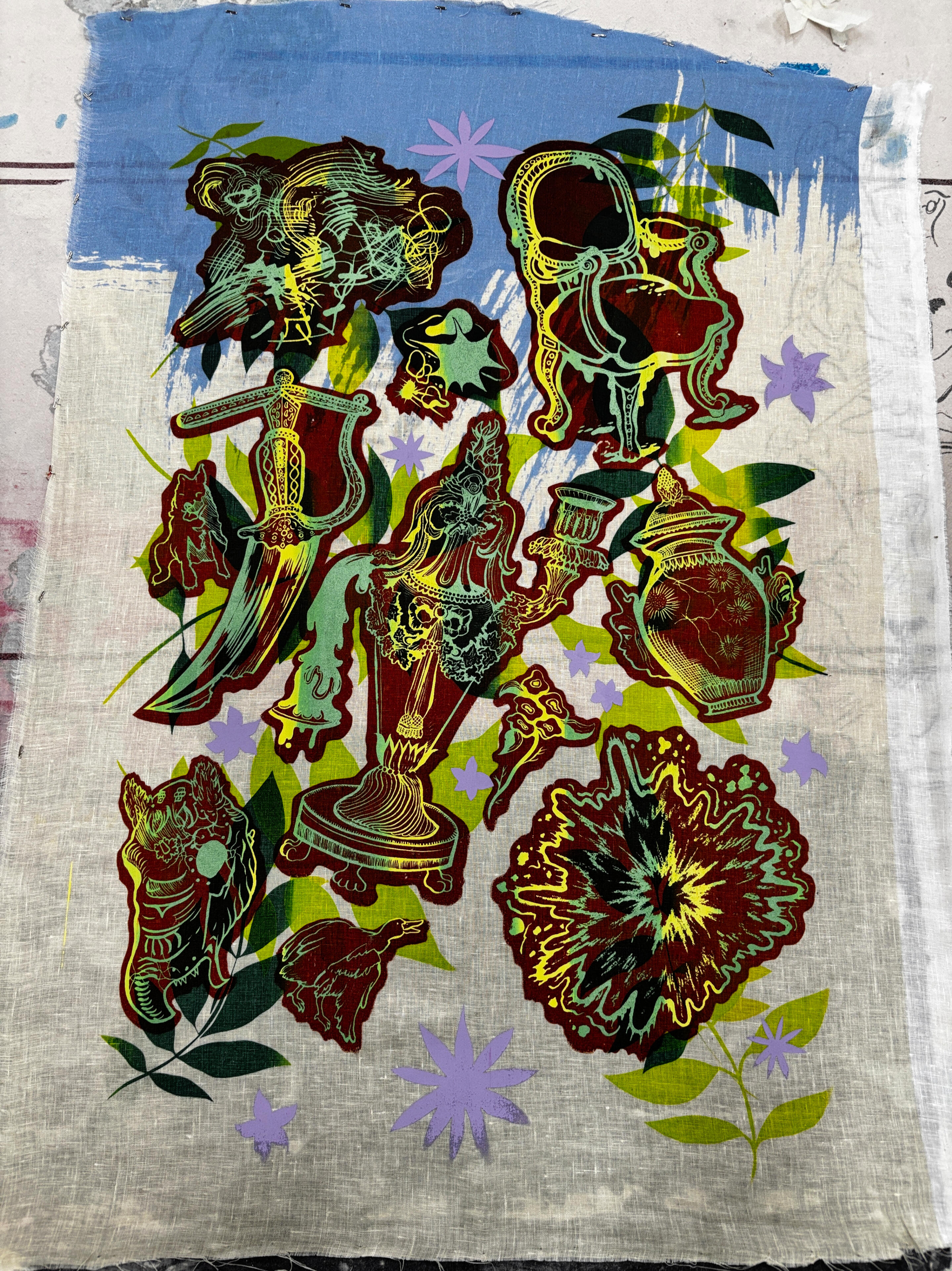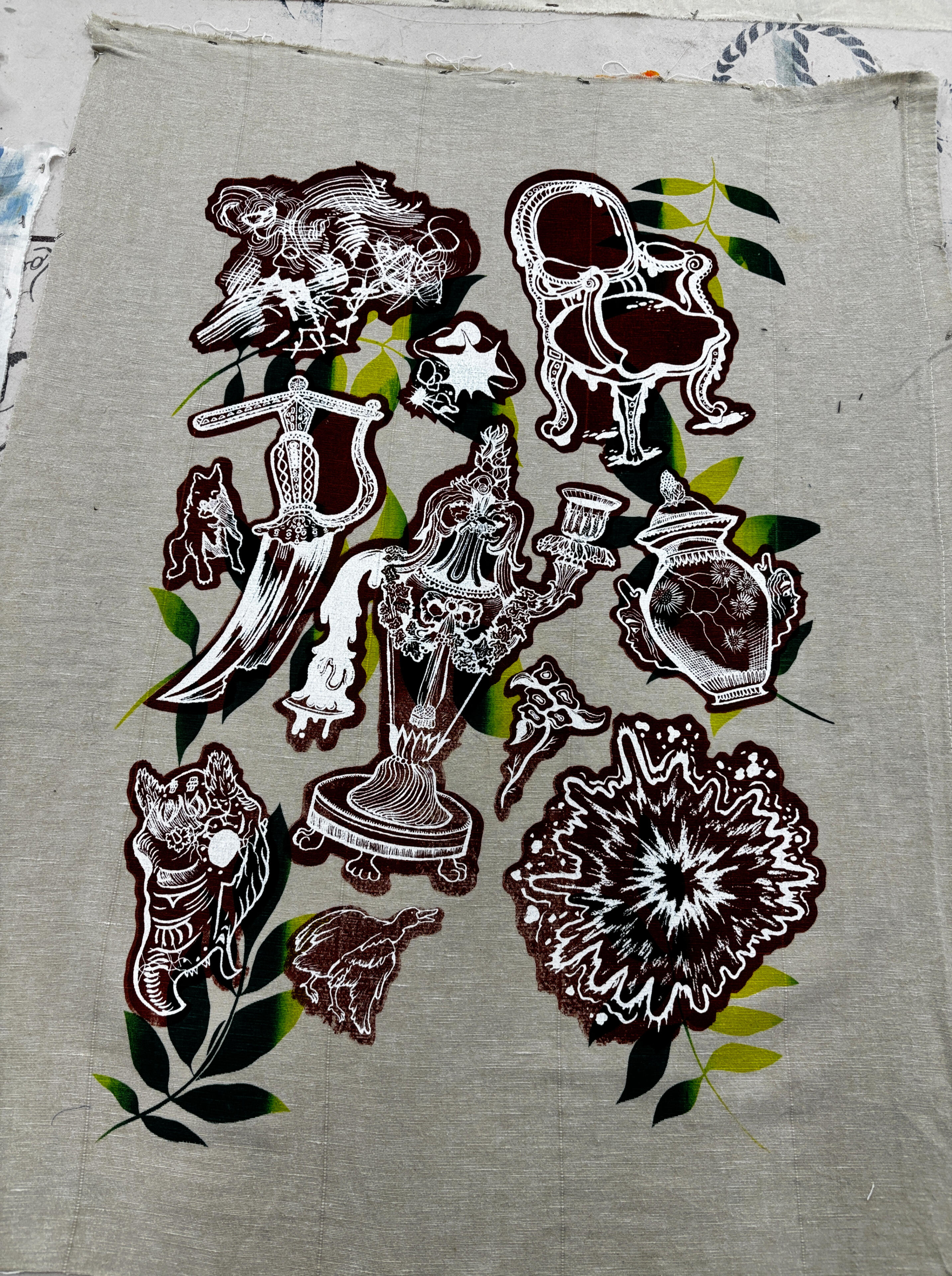 I loved every moment of this course. It was an unfortunate amount of standing that I was not at all used to, but once I got over this, I printed as much as I could, on any fabric I could get ahold of. My screen is full of designs drawn by me, inspired by the cycle of life and decay, with many of the objects in the screen originating from the Wallace Collection in London.